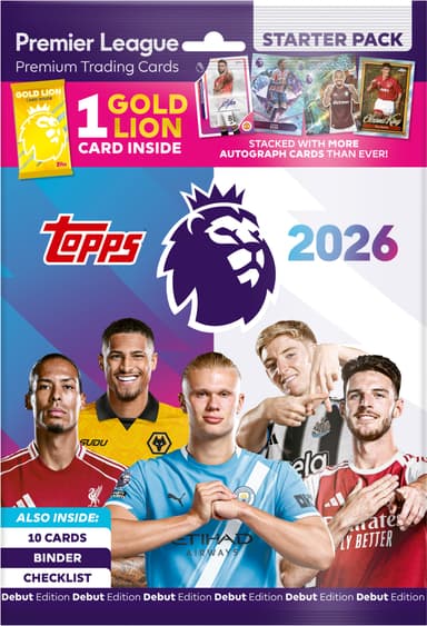 Topps Premier League Starter Pack -keräilykorttipaketti sisältää keräilykansion, tarkistuslistan/peliohjeen ja 10 keräilykorttia. Paketti sisältää myös eksklusiivisen, rajoitetun erän Gold Lion -kortin.Tutustu ominaisuuksiin
