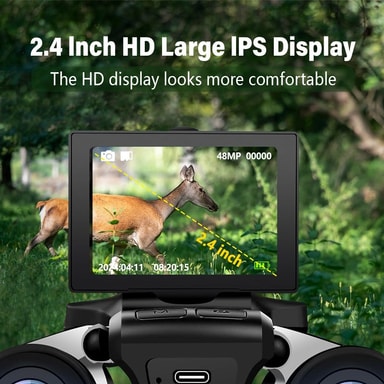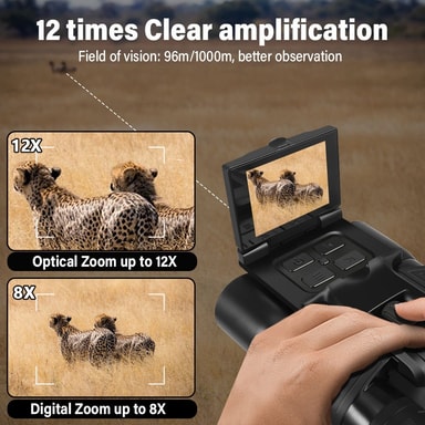 Monipuolinen toiminnallisuus: Nämä digitaaliset kiikarit on suunniteltu monenlaisiin aktiviteetteihin, kuten eläinten tarkkailuun, retkeilyyn, patikointiin, kiipeilyyn, kilpailuihin ja konsertteihin. 12x suurennus ja 32 mm:n objektiivilinssi tarjoavat selkeän ja yksityiskohtaisen näkymän kaukaisiin kohteisiin, kun taas 2.4 tuuman IPS-näyttö mahdollistaa valokuvien ja videoiden helpon katselun. Kiikarit tukevat myös jalustan kiinnitystä vakaata ja handsfree-käyttöä varten. 10 kielivaihtoehdon ja jopa 128 Gt:n SD-korttien tuen (ei sisälly toimitukseen) ansiosta nämä kiikarit ovat monipuolinen työkalu kaikille ulkoilun harrastajille. Ominaisuuksien yhdistelmä tekee siitä sopivan sekä satunnaisille että vakaville käyttäjille, mikä takaa ensiluokkaisen katselukokemuksen kaikissa olosuhteissa.