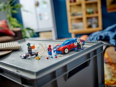 Rakennettava LEGO Marvel lelu kiidättää seikkailuihin pyörien päällä ja yläilmoissa Spider-Manin auton, Vihreän Menninkäisen liiturin ja Ghost-Spiderin skeittilaudan kyydissä.Tutustu ominaisuuksiin