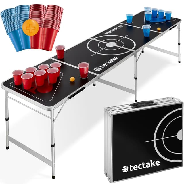 Tectaken viileä beer pong-pöytä Brews & Throws takaa lämpimän tunnelman jokaiseen juhlaan. Kannettava juomapeli toimitetaan täydellisenä settinä, jossa on useita suuria kahdessa värissä olevia kuppeja ja useita palloja. Kevyessä alumiinirungossa on kuusi korkeussäädettävää jalkaa, joissa on luistamattomat muovisuojukset ja ne takaavat erinomaisen vakauden jopa nopeilla kierroksilla. Pinnoitettu puu on naarmuuntumatonta ja roiskeenkestävää - pyyhi vain kostealla liinalla ja tectaken suosittu beer pong -pöytä on valmis seuraavaan käyttöön.