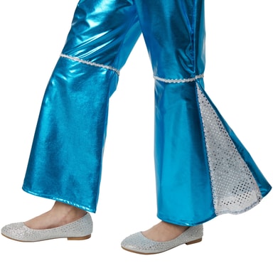 Tämä kimalteleva tyttöjen diskotähtipuku koostuu yksiosaisesta puvusta, joka on kiiltävää neonsinistä kangasta. Pukemista helpottaa suuri vetoketju keskellä edessä, ja syvä V-kaula-aukko ja ommeltu kaulus viittaavat 70-luvun suosittuun tyyliin. Myös hihat ja lahkeet ovat levenevät, ja molemmissa lahkeissa on hopeinen koristeellinen reunus polven korkeudella. Kaulus sekä hihat ja lahkeet on valmistettu vaaleanharmaasta, hopealangalla kietoutuneesta läpikuultavasta kankaasta. Puvussa on myös paljettimaisia hopeanvärisiä yksityiskohtia, ja sen mukana on hopeinen vyö, jossa on ruostumattomasta teräksestä valmistettu solki. Materiaali: Kangas: Kangas, jossa ei ole kenkiä, mutta on myös kenkiä: Materiaali: 95 % polyesteri, 5 % elastaani. Let's party! Tässä kimaltelevassa diskotähden asussa pikkutyttösi on valmis suureen esiintymiseensä. V-pääntie, statement-kaulus, leveät uurretut hihat ja levenevät housut ovat tyypillisiä 70-luvun ylelliselle tyylille. Tässä rohkeassa asussa kimalteleva diskotähti on taatusti tanssilattian kirkkain tähti.