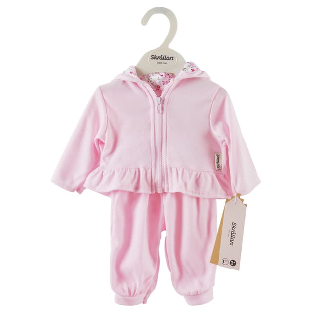 Skrållanin vaaleanpunainen oloasu on mukava ja pehmeä. Setti sisältää hupparin ja pehmeät housut. Täydellinen nukenasu Skrållanille! Sopii 45 cm:n nukeille.