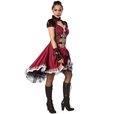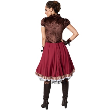 Steampunk-aatelisnaisen puku koostuu lyhythihaisesta satiinimekosta. Kaksinkertaisesti helmaista hameosaa koristaa kaksi pystysuoraan ommeltua vyötä, joissa on soljet. Kaksikerroksinen alushame on valmistettu satiinista ja kiinnitetystä tyllistä. Kaksi vaakasuoraa vyötä on ommeltu keskelle yläosaa, joka on muodoltaan ja ulkonäöltään kuin nahkakorsetin kaltainen liivi. Yläpuolella ehdotetaan nauhoitusta. Pääntie ja lyhyet samettihihat on koristeltu röyhelöillä. Yläpäässä on samettikaulus. Takaosassa on vetoketju. Kaksi sormetonta samettikäsinettä vyöllä ja soljella täydentävät puvun, materiaali: Materiaali: 100 % polyesteri. Steampunk-aatelisnainen on vaeltaja maailmojen välillä. Nauhoitus ja kaunis d�collet� reunuksella muodostavat viehättävän kaula-aukon pysty- ja vaakavöiden ja tyllialushameen kanssa, tässä viktoriaanisen goottilaisen tyylin mukaisesti. Perinteen ja nykyaikaisuuden yhdistelmä. Steampunk-aatelisnainen ilmentää taitavasti vastakohtia retro-futuristisessa maailmassa. Täydellinen naamiaisiin, karnevaaleihin, Halloween-juhliin tai cosplay-tapahtumaan. Oikean puvun, meikin ja asusteiden avulla voit luoda mielikuvituksellasi haluamasi hahmon. Verkkokaupastamme löydät paljon muita tuotteita, kuten peruukkeja ja pukuja naisille, miehille ja lapsille.