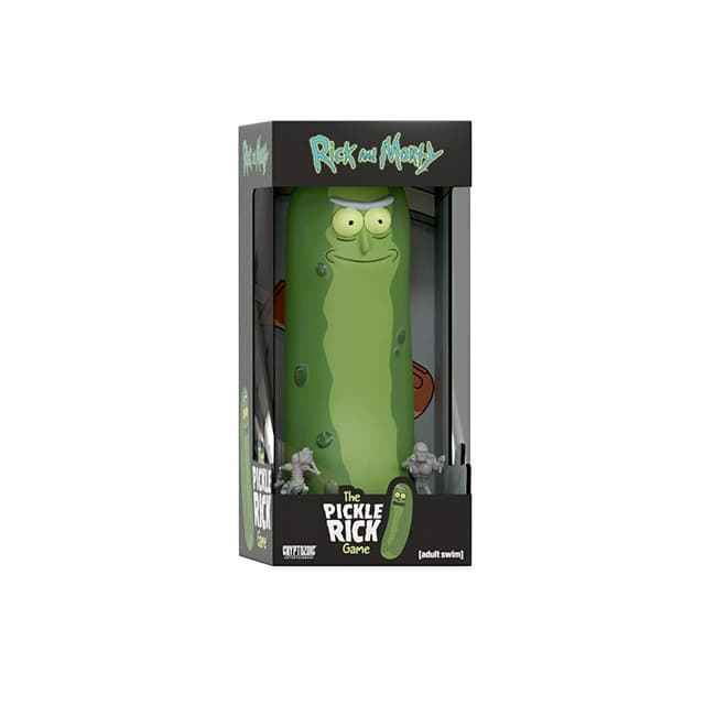 ""pum, suuri paljastus! Muutin itseni suolakurkuksi! Mitäs siitä sanot?"" rick & morty pickle rick -pelissä rick on muuttunut suolakurkuksi ja on ansassa raskaasti aseistetussa laitoksessa. Yksi pelaaja käyttää kortteja ja noppaa yrittäessään paeta ja toinen johtaa aseistettuja vartijoita ja jaguaaria, jotka liikkuvat dynaamisella pelilaudalla yrittäessään estää suolakurkku-rickiä.