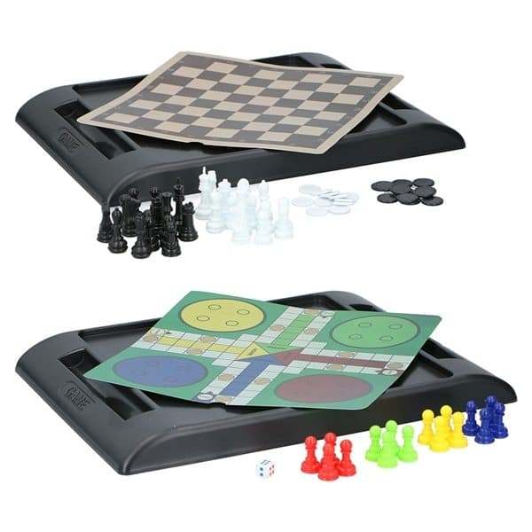 Haluatko pelata shakkia tai fia med knuff-peliä? Silloin tämä sarja sopii juuri sinulle. Peliä on helppo säilyttää ja kuljettaa mukana pelin sivuilla olevien kolojen ansiosta. Vaihda helposti pelien välillä kääntämällä irrotettavaa pelilautaa.