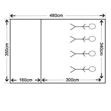 Tekniset tiedot • Mitat yhteensä (LxSxK): n. 480 x 350 x 195 cm • Sisämitat makuutila (LxS): n. 300 x 340 cm • Sisämitat eteinen (LxS): n. 160 x 340 cm • Ikkuna (KxS): n. 75 x 65 cm • Paino: n. 8 kg
