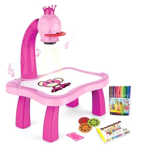 Piirustuspöytä projektorilampulla. Auttaa lastasi kehittämään luovaa kykyään ja oppimaan tunnistamaan ja piirtämään erilaisia ​​värejä ja muotoja. Mukana tulevien kuvalevyjen avulla projektorilamppu heijastaa kuvan esim. eläimestä piirustustuspöydän valkoiselle pinnalle ja lapsi voi sitten värittää sen joko suoraan piirustuspöytään tai paperiin. Piirustuspöydän piirustuspinta on whiteboard-materiaalia, joka on helppo kuivata. Piirustuslehtiö, värikynät, kuvalevyt ja puhdistusliina tulevat mukana. - Kehittää lapsen luovaa ajattelua - Opeta lapsi tunnistamaan värejä ja muotoja Materiaali: ABS Väri: Pinkki Toimii: 3 x AA-paristolla (ei mukana) Mitat: n. 250 x 210 x 350 mm Sisältää: Piirustuspöydän projektorilampulla, 3 kpl kuvalevyä, piirustuslehtiön, värikynät, puhdistusliinan