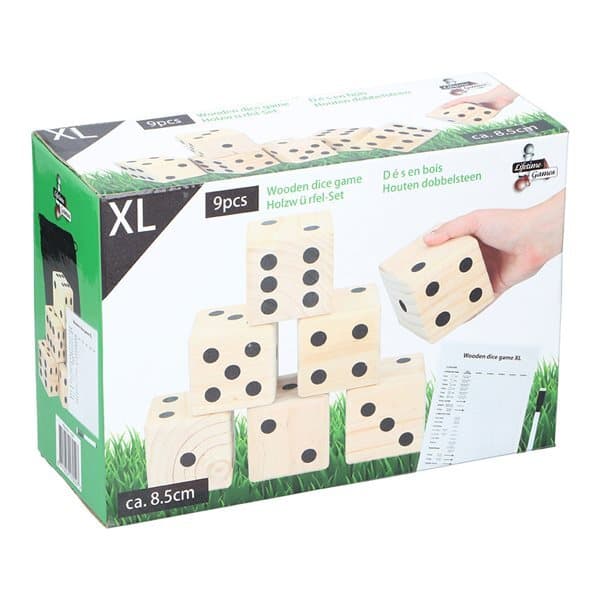 Ainoa ero tavalliseen Yatzyyn on se, että pelaat tätä jättikokoista noppapeliä XL-nopilla. Suuret nopat on valmistettu puusta ja niiden koko on 9x9x9cm. Saat myös tulostaulun, jota voit käyttää yhä uudestaan ja uudestaan, sekä whiteboard-merkitsijän. Kun peli on valmis, voit säilyttää peliä mukana tulevassa säilytyspussissa.