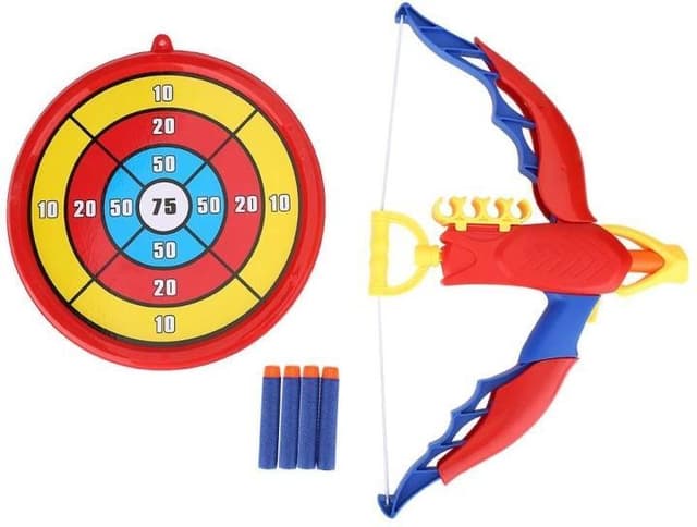 Pilbåge med 4st mjuka skott och måltavla. Med denna pilbåge kan barnen träna på prickskytte på ett roligt men ofarligt sätt.