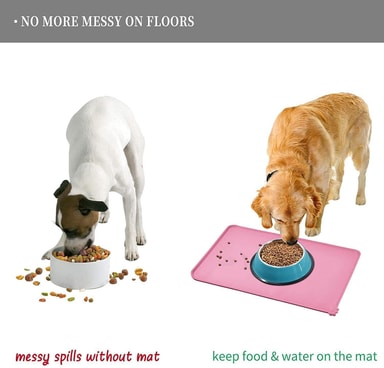 Koiran ja kissan ruokakulhojen matossa on paksut kohotetut reunat, jotka pitävät ruoan ja veden matolla, kun lemmikkisi syö. Vältät tuhoutuneita lattioita! Liukumaton silikoni pitää kulhot paikoillaan.