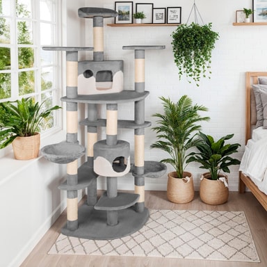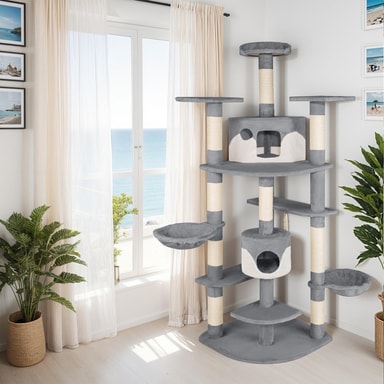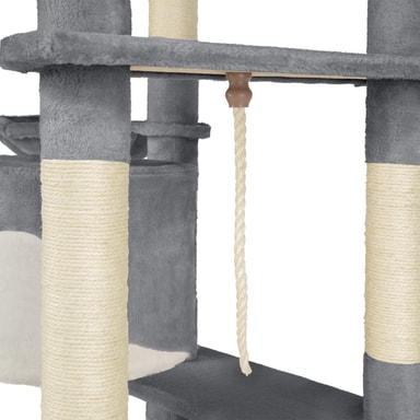 Nelly-kissapuu on pystysuora aktiviteettikeskus kissallesi, joka yltää yli 2 metrin korkeuteen. Kissasi tai kissanpentusi rakastaa käyttää lukuisia suuria, useille tasoille jakautuneita raapimispisteitä kynsiensä teroittamiseen ja ylimääräisten tupien poistamiseen, jolloin huonekalusi jäävät tahrattomiksi. Tähän kissapuuhun kuuluu myös kissatalo ja -luola, jotka ovat ihanteellisia, jotta lemmikkisi voi ottaa torkut viihtyisässä, yksityisessä onkalossa. Mukana on myös roikkuvia köysileluja, joilla kissasi leikkii mielellään, kun se oppii metsästämään ja syöksymään. Kasvavalla korkeudella olevat alustat sopivat täydellisesti rentoutumiseen ja loikoiluun, kunnes korkeimmalle korokkeelle noustaan, jolla kissasi istuu mielellään ja jonka avulla se voi tarkkailla valtakuntaansa uudesta kodistaan käsin! Viihtyisät riippumattojen ripustukset täydentävät tuotteen täydelliseksi kissan päiväunipaikaksi. Hanki tämä erittäin rikastuttava kissapuu Tectakelta ja tyydytä kissojesi luontainen kiipeily-, hyppely- ja raapimisvaisto.