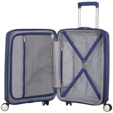 Tvärband i både övre och undre facket, TSA-lås på alla storlekar och dubbla hjul för smidigt rullande.