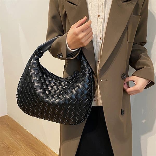 Käsin kudottu olkalaukku kestävästä PU-materiaalista, tilava sisustus - Musta