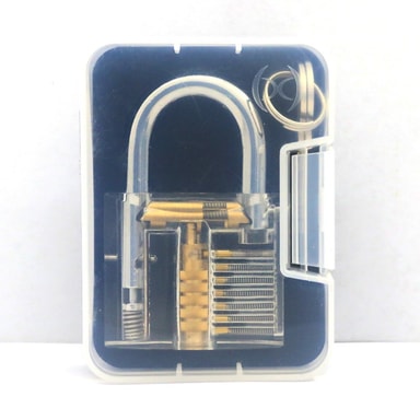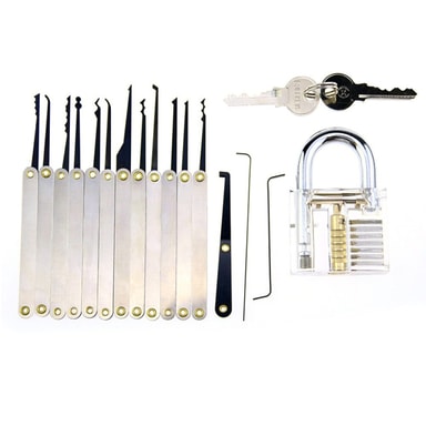 Paketti sisältää: 1 kpl lukko kotelolla+15 kpl työkaluja nahkalaukulla