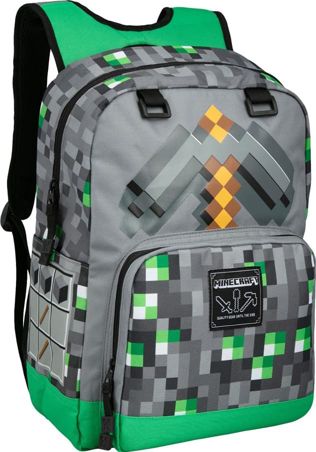 Carry your laptop and items of daily use inside this comfortable Minecraft-themed backpack with Emerald Survivalist design. The backpack has reinforced bottom, padded back, laptop sleeve on the inside, extra zipped compartment and side pockets.Tutustu ominaisuuksiin