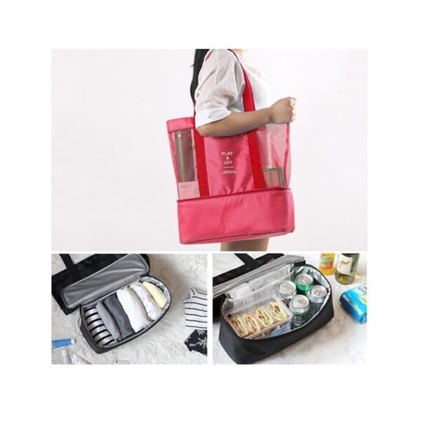 Suuri, tilava ja käytännöllinen laukku, jossa on säilytys- / kylmälaukku alaosassa ja suuri säilytystila yläosassa. Pitkät pehmustetut olkahihnat tarjoavat käyttömukavuutta. Ota tämä suuri laukku mukaan lomalle, rannalle, uima-altaalle, retkelle, grillipaikkaan tai piknikille perhepäivänä, tai anna sen vain pitää ruokasi ja juomasi jäähdytettynä ruokakaupasta kotiin.