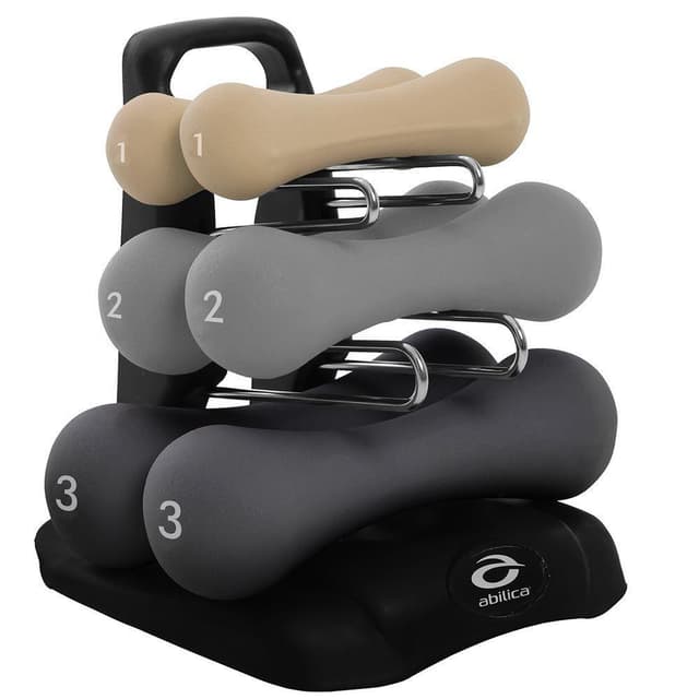 Kolme paria käsipainoja sis. telineen. Käsipainoja on saatavana koossa 2x1 kg, 2x2 kg ja 2x3 kg.Tutustu ominaisuuksiin