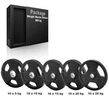 900 kg:n painopakkaus Master Fitnessin suosituilla kumipäällysteisillä valurautalevyillä, joissa on pitävät kahvat. 50 mm tangoille. Nämä painolevyt on tehty käytettäviksi harjoittelutarkoituksiin ja siksi niillä on suurempi virhemarginaali verrattuna kilpailukäyttöön tarkoitettuihin painolevyihin. Virhemarginaali koskee painoa, paksuutta ja halkaisijaa. Mukana painot: 10 x 5 kg 16 x 10 kg 16 x 15 kg 10 x 20 kg 10 x 25 kg