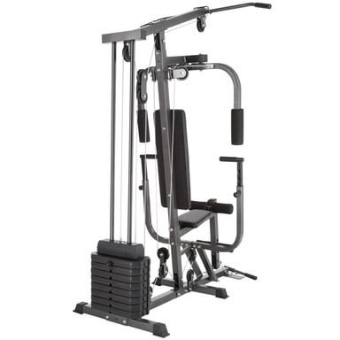 Kohokohdat • Kodin monitoimijumppa erilaisilla harjoitusvaihtoehdoilla • Aloittelijoille ja ammattilaisille • Sopii voimaharjoitteluun ja cardioharjoitteluun • Rintalihakset • Rintapunnerrus • Jalkojen ojennusliike • Latvaveto • Trippislihasten veto • Hauislihasten koukistukset • Painopalikat, joissa on 4 lukitusta nastoilla. 5 kg:n porrastukset • Metalliporraslevy curlingin tekemiseen seisten • Mukavat keinonahkapehmusteet • Muovilla päällystetty teräsvaijeri • Kestävä teräsputkirunko, jossa on lattiaa suojaavat muoviset suojukset • Korkea kuormitettavuus • Vakaa • Färg: musta