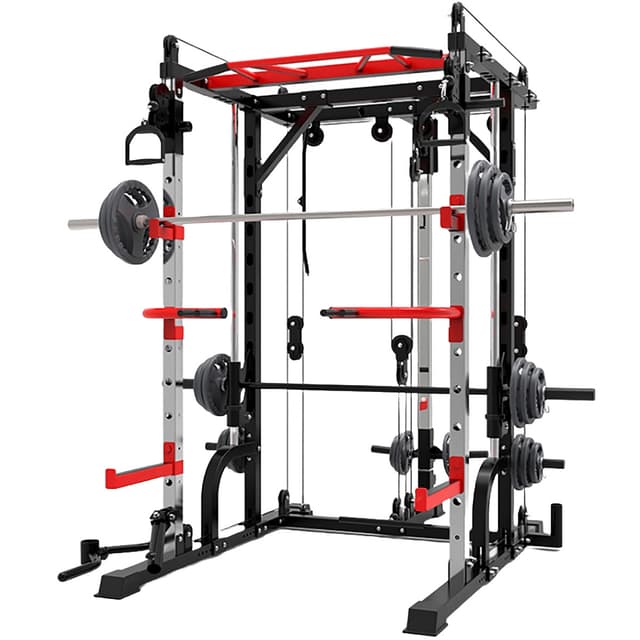 Core Smith rackissä on kiskoilla liikkuva smith-tanko, jolla treenaat niin kyykkyä kuin penkkiä tukevasti ja varmasti putkien myönteistä liikerataa noudattaen. Lisäksi tässä Smith-laitteessa on kaksi ylätaljaa, sekä yksi alatalja mahdollistavat niin ylä- kuin alakropan monipuoliset treenit. Dippiteline ja leuanvetotanko viimeistelevät oman kehonpainolla suoritettavat liikesarjat. Kyykkyhäkki tukee jopa 200 kilon lastin painoja: 200 kg kyykkyteline, 150kg smith-kiskot, 100 kg dippiteline, ylä- ja alatalja, sekä 160kg leuanvetotanko. Tästä syystä siinä on laajasti säädettävissä olevat varmistusraudat, joilla takaat turvalliset nostot.