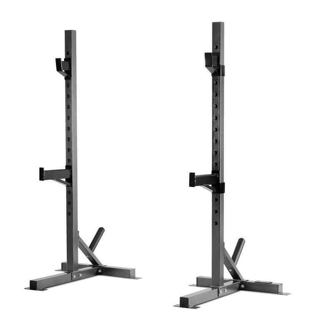 Jämäkkä Squat Stand -kyykkyteline, joka sopii kuntosaliin ja kotiin. Tukijalkojen T-muotoinen malli mahdollistaa sekä penkkipunnerruksen että kyykkyjen harjoittelun. Varmistusvarret ja J-hook -pidikkeet sisältyvät toimitukseen.