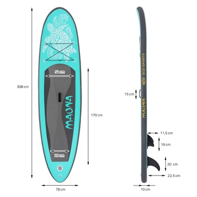 Toimituksen laajuus:1x Stand Up melontalaudan3x evä1x kuljetusreppu1x ilmapumppu, jossa on painemittari1x korjaussarja1x 3-osainen mela1x turvaköysi1x käyttöohjeTekniset tiedot:Materiaali: melontalaudan valmistettu PVC, liukastumisenestopi