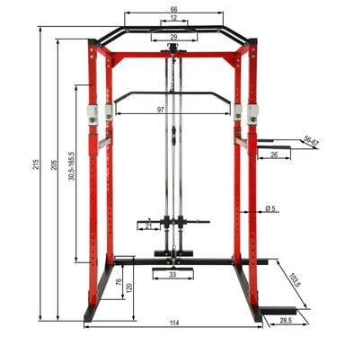 Tekniset tiedot • Kokonaismitat (LxSxK): 136 x 142,5 x 215 cm • Teräsrungon halkaisija: 5 cm • Materiaalin paksuus teräsrunko: 2 mm • Säätöalue: 30,5 - 165,5 cm • Korkeussäätöjen määrä: 28 • Aukkojen etäisyys toisistaan: 5 cm • • Säätöleveydeltään säädettävät upotustangot: 56, 61, 67 cm • Suuret käsipainojen otot (LxS): 8 x 5 cm • Hyväksytty käyttäjäpaino: 100 kg • Kantavuus lat-veto: 100 kg • Kantavuus käsipainoteline: 75 kg • Lat-veto sopii vakiopainoille 25 mm:n vastaanottimella • Paino: 73 kg • Materiaali: teräs, polypropeeni . Toimitus • Voimatorni, jossa on lat pulldown tanko • Kokoonpano-ohjeet