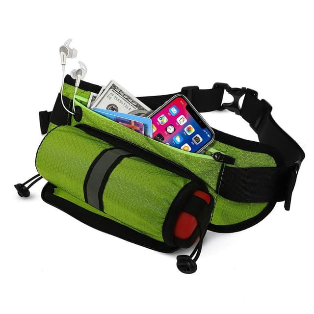 Kevyt ja vedenpitävä urheilullinen vyötärölaukku, jossa mukava, säädettävä hihna (72-115 cm) ja lokerot matkapuhelimelle, avaimet ja paljon muuta. Suuressa lokerossa on kaksi sisätaskua sekä sulkurengas ja aukko kuulokkeiden johtoa varten. Älykäs pulloteline on piilotettu pieneen etutaskuun, ja se voidaan helposti nostaa - tai taittaa alas, kun haluat käyttää vyötärölaitetta ilman vesipulloa (pullo ei sisälly toimitukseen) . Sekä pullonpidikkeen että vyötärönauhan heijastimet auttavat sinua näkemään pimeässä.