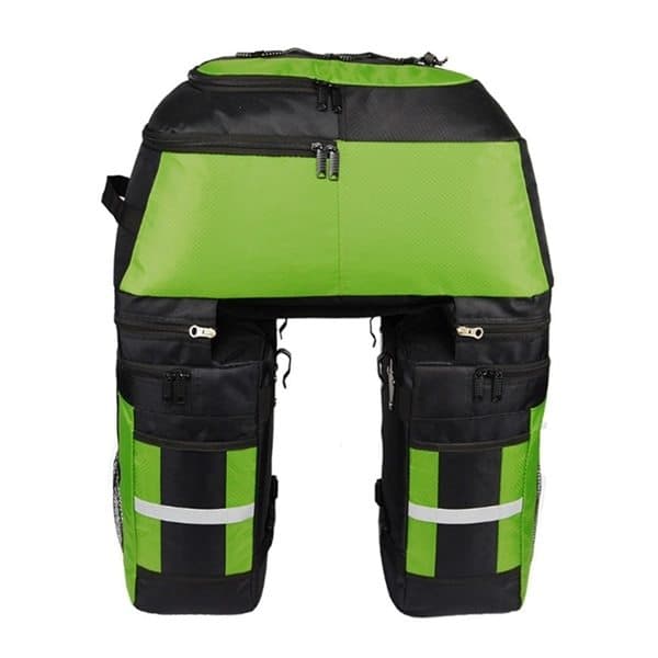 Tässä laukussa on useita taskuja ja runsaasti tilaa pyöräretkeä varten. Se kiinnitetään helposti ja turvallisti tavaratelineeseen ilman, että se hankaa pyörän renkaaseen. Takana oleva heijastava materiaali tekee sinusta näkyvämmän pimeässä. Yläosa voidaan erottaa muista osista ja se toimii myös reppuna.