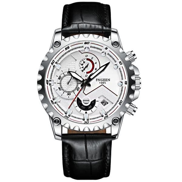Tyylikäs kello mustalla nahkarannekkeella ja hopeisella taustalla! Vesitiivis 3ATM, kestää vesiroiskeet ja satunnaiset vikkelät hetket vedessä. Ø 43,5 mm.