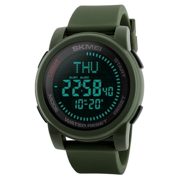 Tyylikäs moderni urheilukello, jossa on ominaisuuksia, kuten kompassi, päivämäärän näyttö, herätyskello, sekuntikello jne. Vedenpitävä jopa 50 metrin syvyyteen saakka, joten sinun ei tarvitse koskaan huolestua, jos olet unohtanut kellon ranteeseesi!