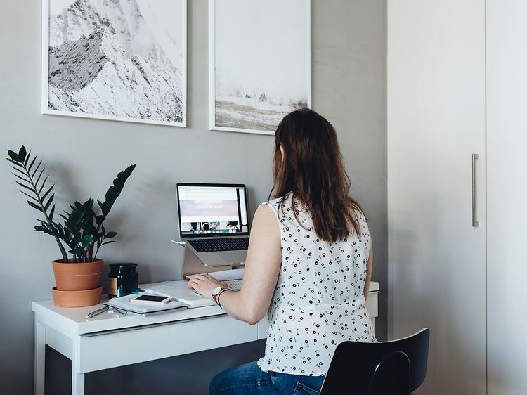 Nainen työskentelee kannettavalla kotitoimistossaan
