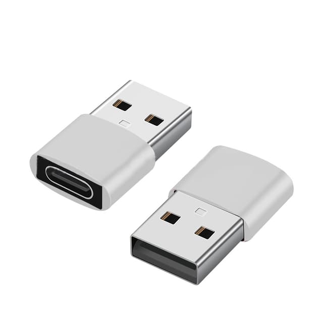 2 kpl USB-C–USB-sovittimia tiedonsiirtoon ja lataamiseen Hopea