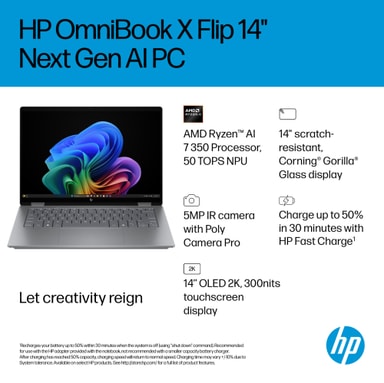 14" HP OmniBook X Flip AI 7-350/32/512/OLED -kannettava tarjoaa tehokkaan suorituskyvyn AMD Ryzen™ AI 7 -prosessorilla sekä laadukkaan kuvantoiston 2K OLED -näytöllä. Tehosta työskentelyäsi ja pysy tehokkaana pitkiäkin aikoja.Tutustu ominaisuuksiin