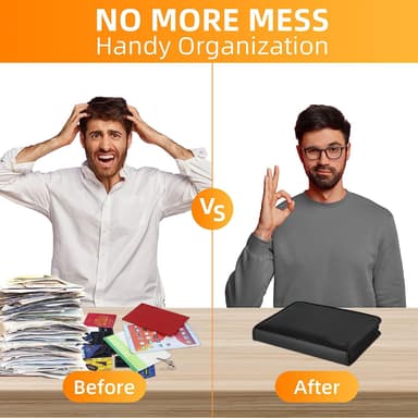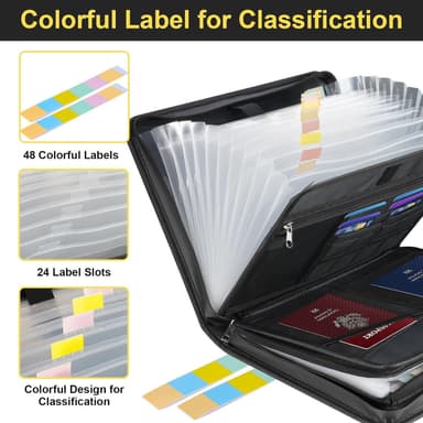 Suuri kapasiteetti: Kansiossa on useita lokeroita ja laajennettavia asiakirjakansioita, jotka tarjoavat runsaasti tilaa asiakirjojen, passien, todistusten, käteisen ja muiden arvoesineiden järjestämiseen.