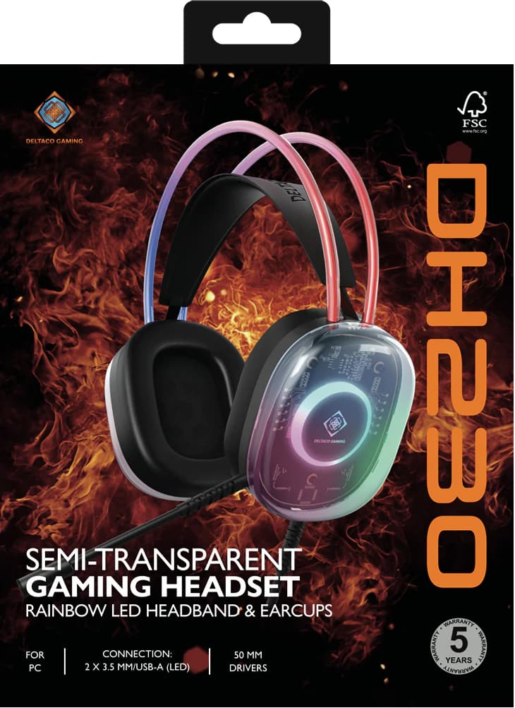 Deltaco DH230 RGB -pelikuulokkeet tarjoavat immersiivisen äänentoiston sateenkaarevalla RGB-valaistuksella kuulokepannassa ja läpinäkyvissä korvakupeissa. Mukana on 50 mm elementit, taipuisa mikrofoni, itsesäätyvä kuulokepanta ja 2 m punottu kaapeli.Tutustu ominaisuuksiin