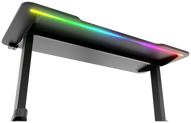 Pöydässä on tukeva teräsrunko, joka takaa vakauden ja hyvän tuen pelivälineillesi. Pöydän leveys on 136 cm ja syvyys 60 cm, joten se sopii mihin tahansa pelihuoneeseen. Voit säätää pöydän korkeutta ja valita 3 asetuksen välillä: 71, 76 tai 81 cm. Pöytä tukee jopa100 kg painoa, ja kaunis musta pinnoite RGB-valoilla tuo huoneeseesi uutta tyyliä.
