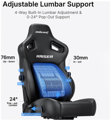 AndaSeat Kaiser 4 Series -pelituoli on suunniteltu parantamaan pelikokemustasi keskittymällä mukavuuteen ja tukeen. Tämä tuoli on suunniteltu ammattilaispelaajille, ja siinä on vankka rakenne, joka kestää enintään 120 kg painon. Se on varustettu useilla säädettävillä ominaisuuksilla, jotka takaavat yksilöllisen istuvuuden, joten se soveltuu pitkiin pelisessioihin.