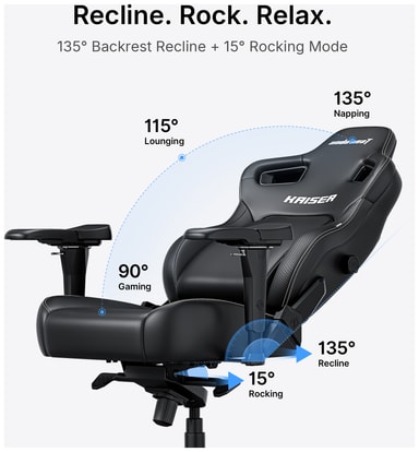 AndaSeat Kaiser Series 4 -pelituolissa on 135° kallistus- ja 15° keinumismahdollisuus, joten voit rentoutua mahdollisimman mukavasti. Näiden ominaisuuksien avulla voit löytää täydellisen asennon pelaamista, lukemista tai taukoa varten.