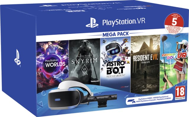 PlayStation VR Mega Pack 2 auttaa sinut alkuun, kun haluat aloittaa seikkailusi virtuaalimaailmassa. Pakkaus sisältää PlayStation-VR-lasit, PlayStation-kameran sekä 5 VR-peliä.
