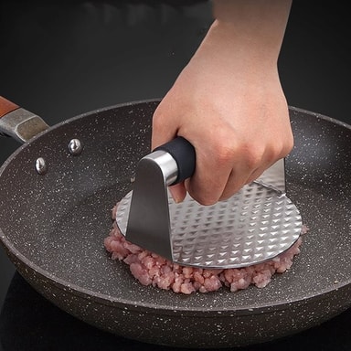 • Smash Iron / ruostumattomasta teräksestä valmistettu hampurilaispuristin, jossa on silikonikahva