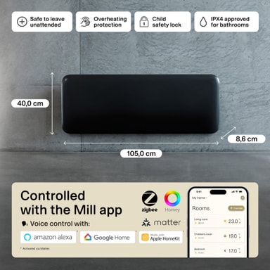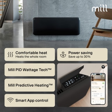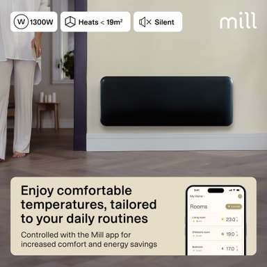 Mill Invisible Smart Wi-Fi Gen4 -lämpöpaneeli lämmittää enintään 19 m² huoneita. Siinä on elektroninen termostaatti, ja se on turvallinen käytettäväksi kosteissa tiloissa. Se voidaan yhdistää Mill Wi-Fi -sovellukseen tehostettua ohjausta varten.Tutustu ominaisuuksiin