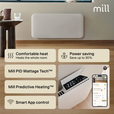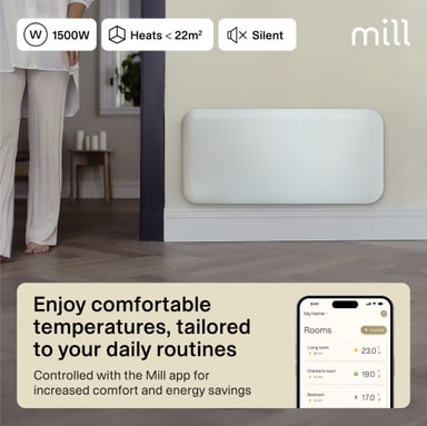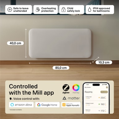 Mill Invisible Smart Wi-Fi Gen4 -lämpöpaneeli lämmittää enintään 22 m² huoneita. Siinä on elektroninen termostaatti, ja se on turvallinen käytettäväksi kosteissa tiloissa. Se voidaan yhdistää Mill Wi-Fi -sovellukseen tehostettua ohjausta varten.Tutustu ominaisuuksiin