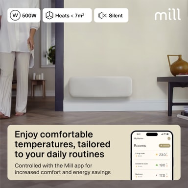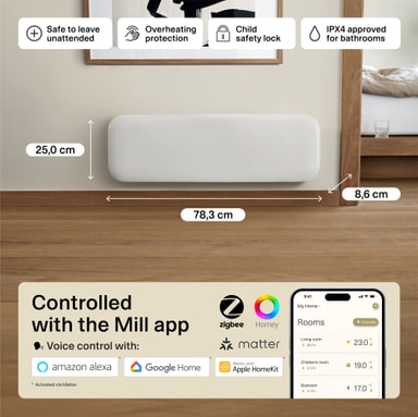 Mill Invisible Smart Wi-Fi Gen4 -lämpöpaneeli lämmittää enintään 7 m² huoneita. Siinä on elektroninen termostaatti, ja se on turvallinen käytettäväksi kosteissa tiloissa. Se voidaan yhdistää Mill Wi-Fi -sovellukseen tehostettua ohjausta varten.Tutustu ominaisuuksiin