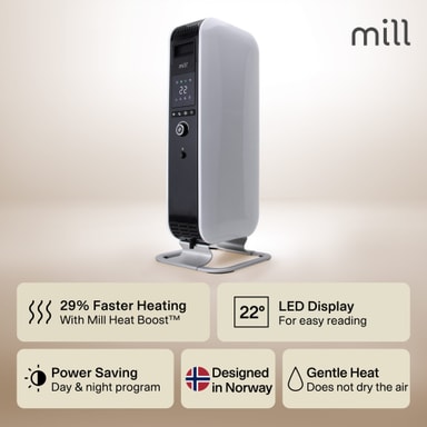 Öljytäytteisessä Mill Premium -lämmittimessä on pelkistetty, nykyaikainen muotoilu, LED-näyttö ja elektroninen termostaatti.Tutustu ominaisuuksiin
