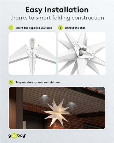• Snabbt och enkelt att montera tack vare den stabila hopfällbara konstruktionen: sätt in den medföljande LED-lampan, fälla upp ljusstjärnan, häng upp den och sätt på den