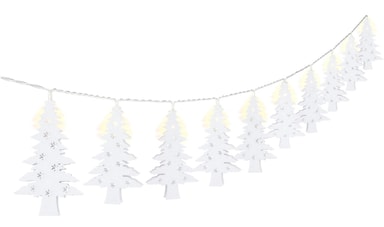 Sopii täydellisesti jokaiseen joulu- ja talvikoristeeseen. Kaunis valoketju levittää miellyttävää valoa ja juhlatunnelmaa. Jokainen valaisin on koristeltu valkoisen kuusen muotoisella metalliriipuksella.