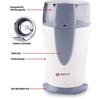 Kahvimylly läpinäkyvällä kannella ja luistamattomilla kumijaloilla