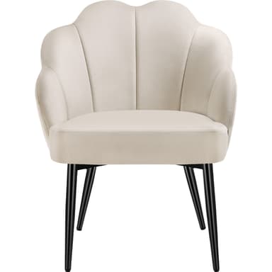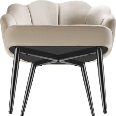 Sen erityinen viehätys piilee selkänojan elegantissa simpukkamuodossa, joka ei vain visuaalisesti vaikuta, vaan - kuten istuinosa - vakuuttaa myös mukavalla pehmusteellaan. Pehmeä samettipäällyste tarjoaa miellyttävän ihotuntuman ja vaatii vain minimaalista hoitoa.