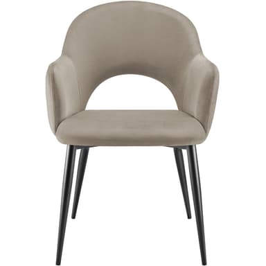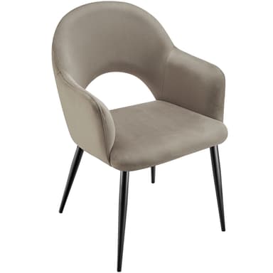 Ruokailutuolin istuinkupit vakuuttavat hienostuneella yhdistelmällä pehmustettuja käsinojia ja kevyesti kaartuvaa selkänojaa. Yhdistelmä silkinpehmeän samettiverhoilun kanssa antaa tuoleille paitsi erityisen eleganssin, myös erittäin miellyttävän istumiskokemuksen. Lisämukavuutta tarjoaa sinulle mukava pehmuste, jossa on korkeatiheyksinen vaahtomuovitäyte, joka kutsuu pitkille, viihtyisille hetkille ruokapöydän ääressä.